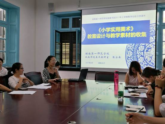 会上,易文颖从音乐学科的特点出发就撰写思路、前期准备和框架构思等方面分享了自己的经验,提出要把重点和大部分学生共同的难点标注出来,课后检验及回课记录要详细写在教学后记中;李晖旭要求优秀教案要从教学目的、重点难点、教学方法、过程设计、教学内容引入、技能训练内容的安排、教学小结和作业等方面要体现出创新性、差异性、教学艺术性,可操作性和可变化性;张容舟则结合《小学实用美术》课程通过PPT图文并茂地向大家展示了如何做教案设计和收集教学素材,强调要做好多次备课,构建整体框架,利用各种渠道收集符合教学内容的素材等。