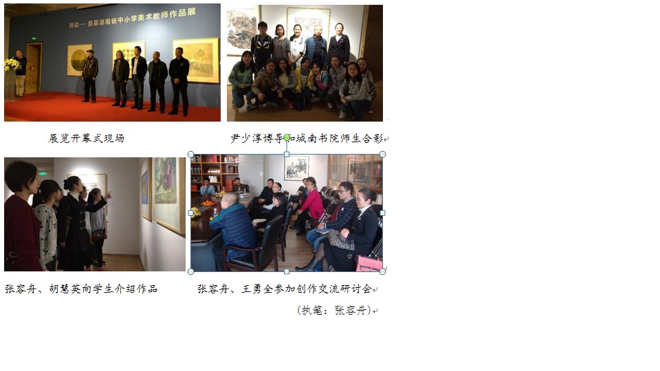 2016年3月19日下午,我院部分学生在张容舟、胡慧英老师带领下来到美仑美术馆参观了“师说——首届湖南省中小学美术教师书画作品展”,王勇全、张容舟和学生代表蒋晴还参加了创作研讨交流会。首都师范大学博导、亚洲美术教育研究发展中心主任、教育部基础教育课程改革美术课程标准研制课题组组长、中国美术家协会少儿艺术委员会主任尹少淳教授出席了展览开幕式,并发表讲话。