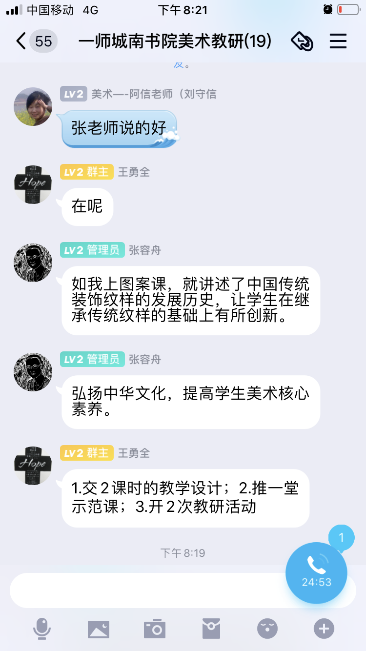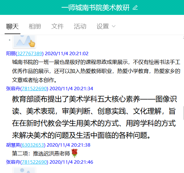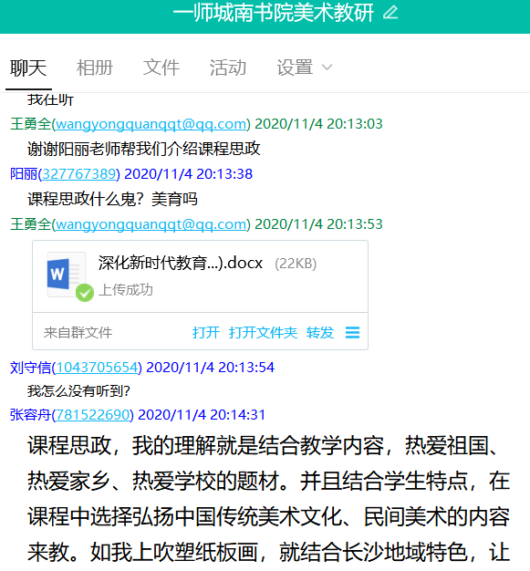 2020.11.04晚上8点至10点,美术教研室的全体教师通过线上的方式,再次学习了教育部《深化新时代教育评价改革总体方案》和《湖南第一师范学院关于课程思政建设的实施意见》文件,12名美术教师分别发表了对课程思政的理解,并按教育部文件与学校意见,分享在美术教学中建设课程思政的观点。作为高校教师,坚持社会主义办学方向,把《总体方案》的要求落到实处,遵循教育规律,积极探索各种教学方法和教学模式在《美术基础》、《小学实用美术》课程中的应用,着力培养学生的教师美术技能,注重学生德智体美劳全面发展,提高教育教学水平和人才培养质量,努力培养担当中华民族复兴大任的时代新人。