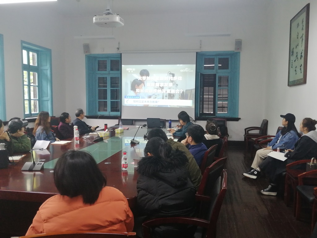 张院长首先组织大家观看了西安交通大学王树国校长在央视财经频道《中国经济大讲堂》上的专题讲座,王校长从我们需要怎么样的大学、大学教育未来该向何处去和大学的变革正在发生等方面进行了精彩的阐述,并探索21世纪中国未来大学新形态,提出我们未来培养的中国学生应该具备国际视野,而大学应该为他们未来的成长提供一个国际化的环境。大学与社会深度融合,共同探寻未来世界前沿性问题的答案,在创新的过程当中去培养人才。