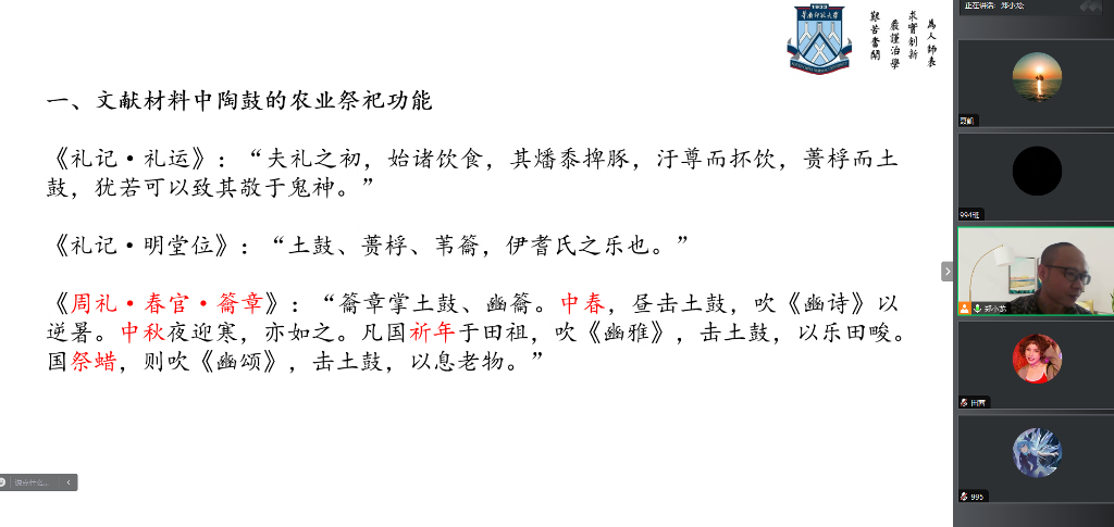 11月30日晚,我院音舞教研室郑小龙博士,在腾讯会议给我院师生带了一场题为“从文献视角看新石器时代陶鼓的音乐功能”的学术讲座。学生在各班固定教室集中观看。