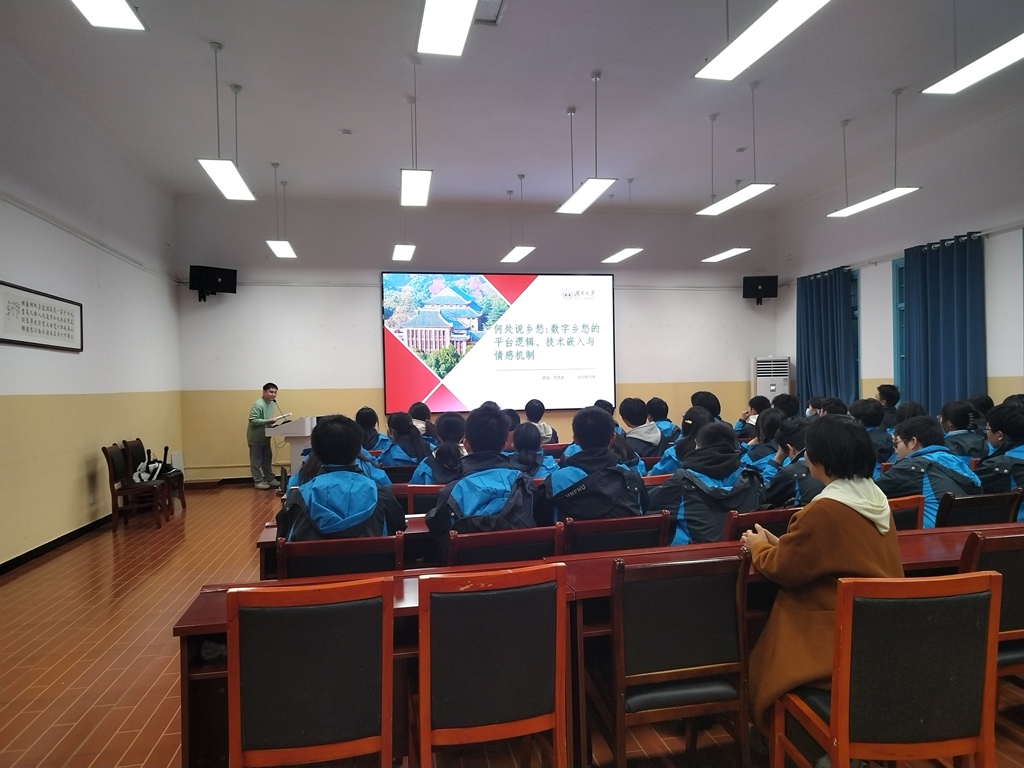 12月7号晚,教师口语教研室范双武博士为我院学生作了一堂题为《何处说乡愁-数字乡愁的平台逻辑、技术嵌入与情感机制》的学术讲座。