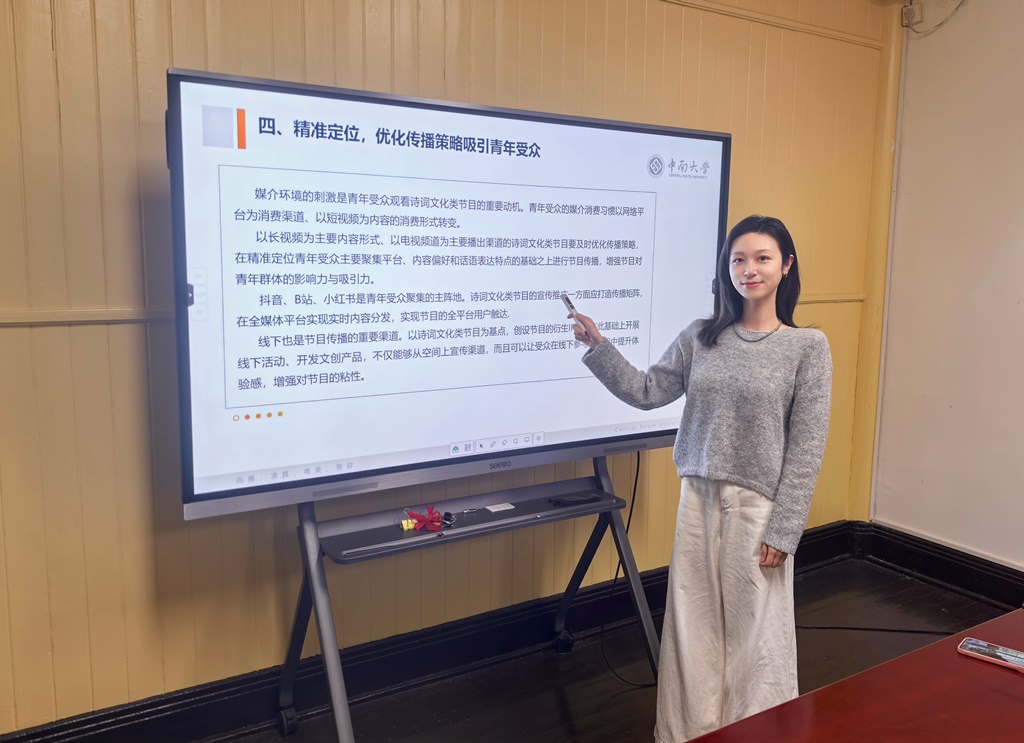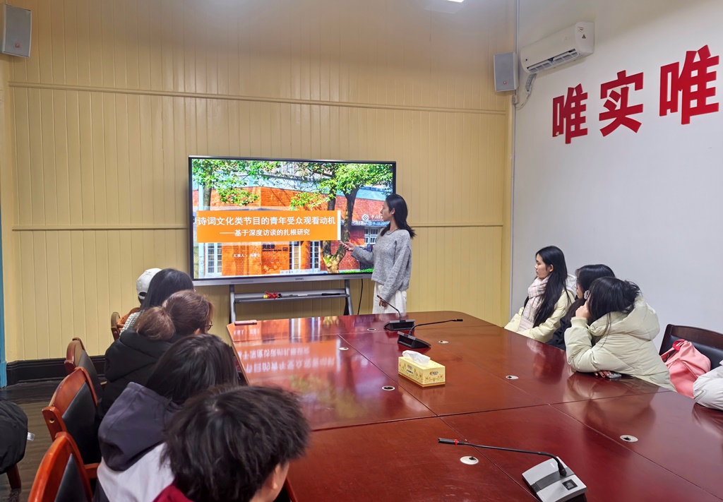 12月5日,我院杨璧全博士在明道苑208给城南校区学生分享其课题组新研究《诗词文化类节目的青年受众观看动机——基于深度访谈的扎根研究》。杨璧全表示,诗词文化类节目在创新传承中华优秀传统文化、凝聚民族精神、丰富视听行业内容形态等方面发挥着积极作用,但近年来也出现了收视率走低与讨论度减弱等发展瓶颈。青年群体是中华优秀传统文化的传承主体与主要对象,对青年受众的观看心理进行深度剖析,能够以青年受众的观看兴趣与需求指导节目创新升级。