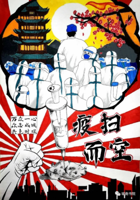作品中文字取材于全国各地的抗疫情标语,体现灾祸面前,人们众志成城抗击病毒的决心,作品中的黄鹤楼是中国十大名楼之一,它代表了武汉。而针筒消灭病毒更是代表了武汉人民抗击病毒的必胜气势。