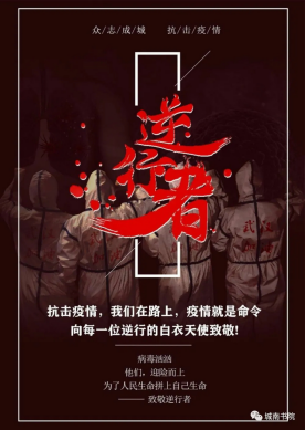 钟南山院士曾说:“选择医学可能是偶然,但你一旦选择了,就必须用一生的忠诚和热情去对待它。”这幅海报就夸赞了逆行的白衣天使。
