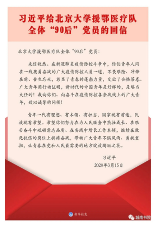 3月15日,习近平总书记给北京大学援鄂医疗队全体“90后”党员回信,表扬青年人同在一线英勇奋战的广大疫情防控人员,彰显了青春的蓬勃力量,交出了合格答卷。