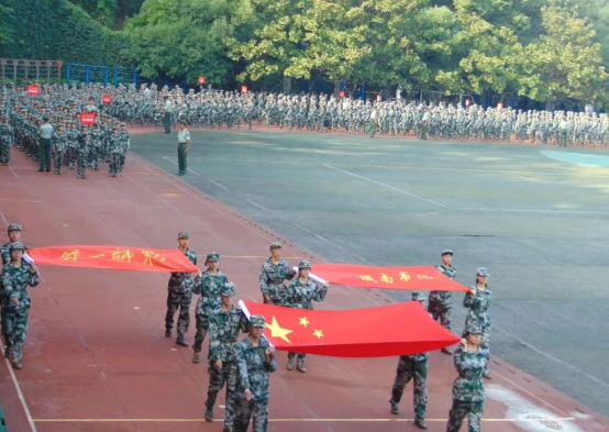 大会正式开始,全体肃立,迎国旗,奏唱国歌;迎校旗、院旗,奏唱校歌。总教官宣布方阵分列式正式开始。