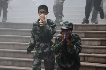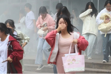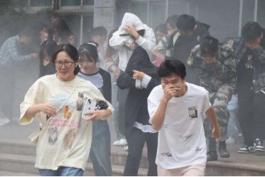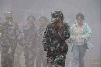 第一阶段为模拟教学楼突发火情下学生的应急疏散演练。“呜......呜......”伴随着应急警报拉响,教学楼内同学们在楼内安全员引导下用湿布捂着口鼻,弯腰快速从烟雾弥漫的教学楼撤离到田径场。在各班清点人数后,现场授课的彭教官对疏散过程中出现的问题逐一进行了点评。针对在火情中遇险人员的处理,彭教官为同学们讲解了如何对伤员进行心肺复苏,并邀请同学上台进行现场演示并为同学们详细解说了灭火器的使用常识,重点根据近年来发生的火灾惨案警醒同学们特别注意寝室消防安全。