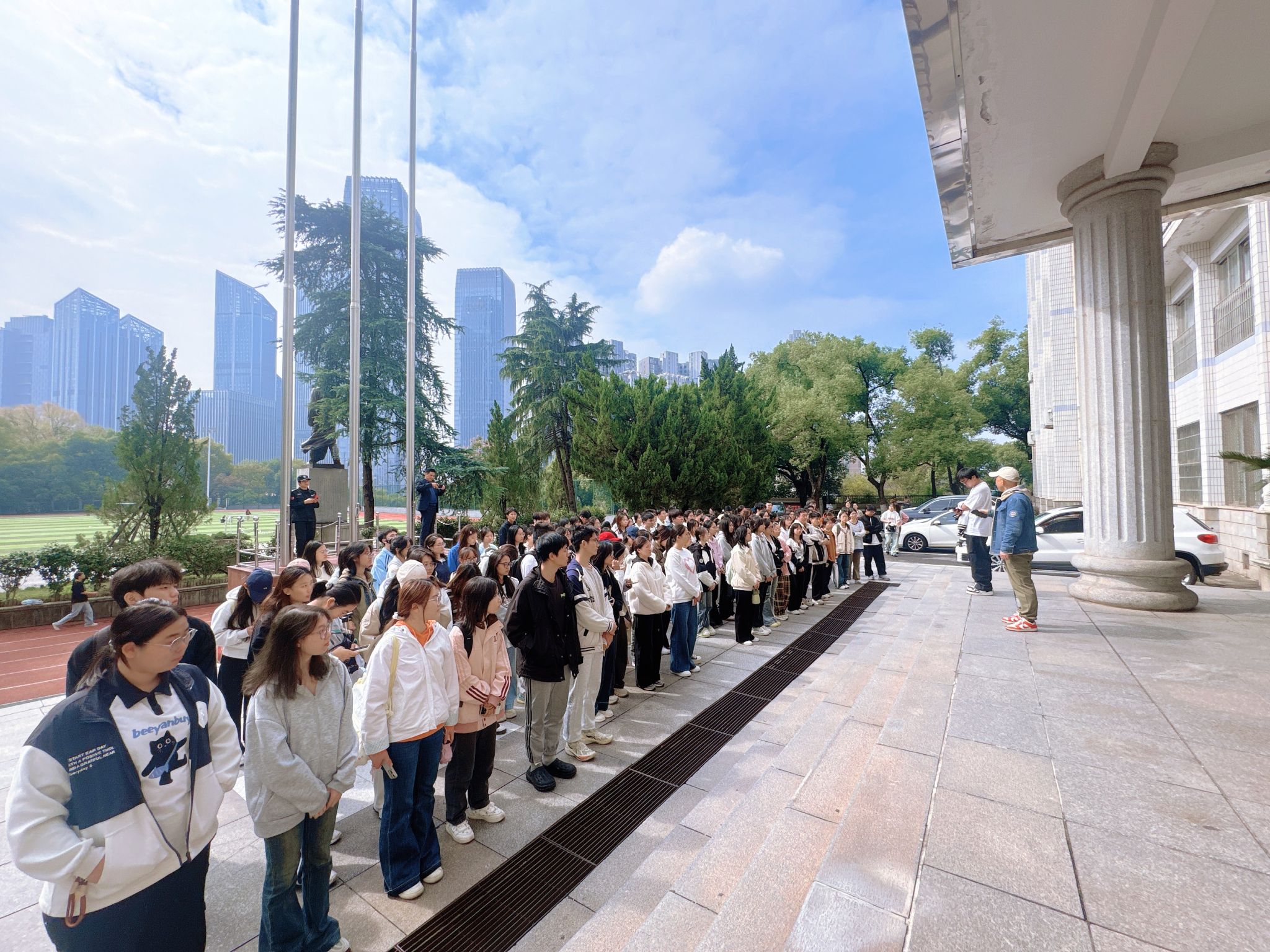 中午12:30,演习正式启动。模拟“教学楼因电器使用不当引发火情,伴有浓烟扩散”的警报信号响起,楼管、辅导员第一时间到位,引导学生用湿毛巾捂住口鼻沿楼梯快速向田径场疏散,有序避开“着火区域”,沿预定路线撤离。整个疏散过程紧张高效,全体参与人员仅用3分钟便全部安全到达集合点,各学院随即清点人数并向总指挥汇报,无“人员遗漏”。