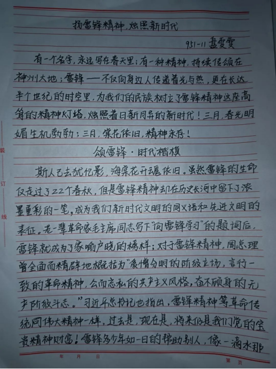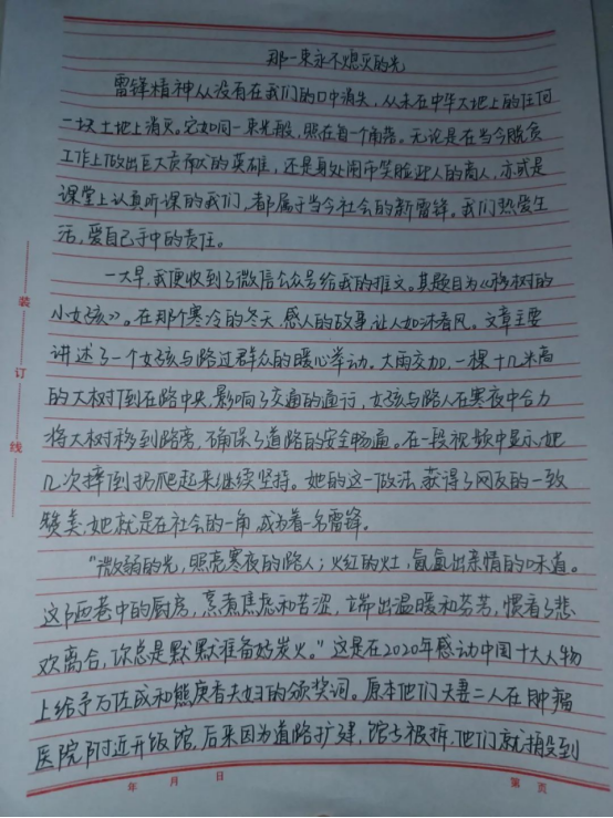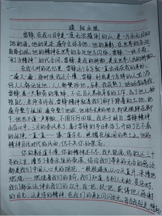 雷锋日记展现了雷锋全心全意为人民服务作风,喧响着雷锋全心全意为人民服务的嘹亮心声,也彰显着雷锋全心全意为人民服务的革命人生观和幸福观。续写雷锋日记,让我校学生深刻地体会到雷锋精神的内涵,跨时代与雷锋同志进行交流,向雷锋同志学习: