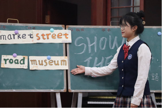 “一二一,向右转”,接下来由951英语班的同学带来微课《指路》。她们通过有趣的互动游戏教授我们怎样问路,中英文反复转换的提问让人印象深刻,不知不觉中就让人掌握了问路的小技巧。