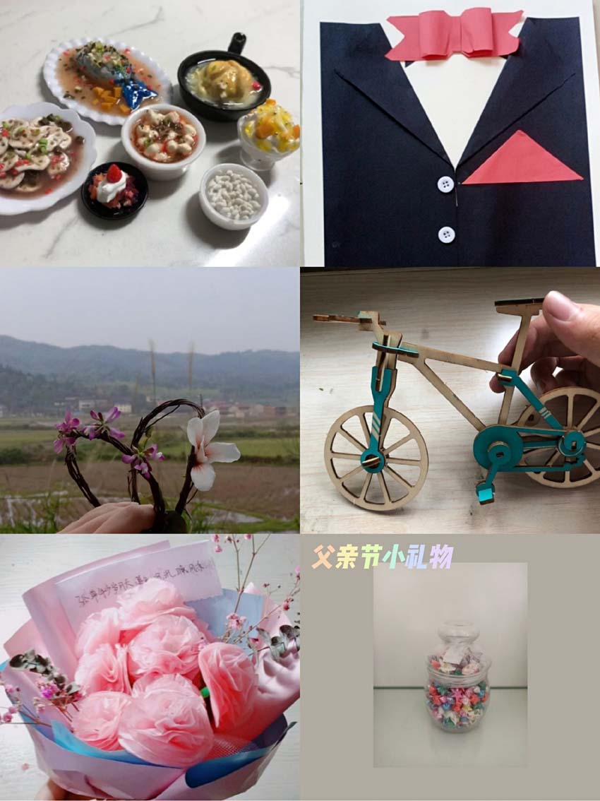 活动由时光机、从前慢、DIY手工坊、火力全开的厨神等四个板块构成,其中“时光机”是找出一张小时候与父亲的合照,并和父亲模仿合照上的动作再拍一张,温馨又逗趣;“从前慢”倡议同学们给自己的父亲写一封信,勇敢表达爱,暖心又感人;“DIY手工坊”则发挥同学们的手工优势,大家各显神通,做出了不少心意满满的小礼物送给父亲,精致又特别;“火力全开的厨神”见证了同学们的精湛厨艺,亲手烹制的菜肴带给父亲更多的是感动与贴心。