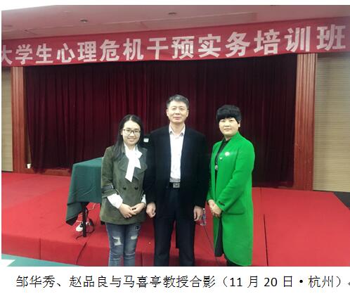 此前,邹华秀副书记与赵品良老师于11月19日-11月20日在杭州参与了为期两天的“大学生心理危机干预实务培训班”。此次培训由中国心理卫生协会大学生心理咨询专业委员会主办,由委员会秘书长、北京航空航天大学大学生心理咨询与发展辅导研究中心主任马喜亭教授主讲。
