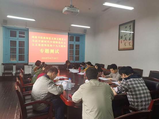 为掌握支部党员对习近平新时代中国特色社会主义思想和党的十九大精神的学习情况,进一步督促教师党员学深悟透思想理论。2019年4月16日下午,教师党支部在前楼会议室组织开展“《习近平新时代中国特色社会主义思想和党的十九大精神》专题测试”主题党日活动。所有在岗党员教师参加会议,会议由支部书记聂凯主持。