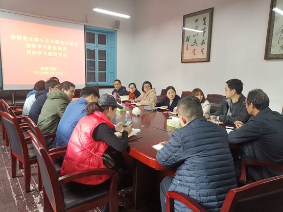 2019年3月12日下午,教师党支部在前楼会议室组织开展“创新学习教育形式 用好学习强国平台”主题党日活动。所有在岗党员教师参加会议,会议由支部书记聂凯主持。