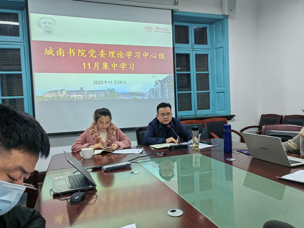 鲁云生首先宣读了学校《关于举行2022年党委理论学习中心组11月集体学习的通知》,说明了此次学习的主要内容、学习方式和学习要求。随后,口语教研室主任李晖旭领学习近平总书记在中央政治局第一次集体学习时的讲话;音舞教研室副主任田茜领学《中国共产党章程(修正案)》;美术教研室副主任王勇全领学《中国共产党宣传工作简史》;党委副书记申鸣凤领学《中国共产党的一百年》;主持行政工作副院长张瑞智领学《百年大党面对面》;副院长蔡海军领学《碳达峰碳中和(干部读本)》。