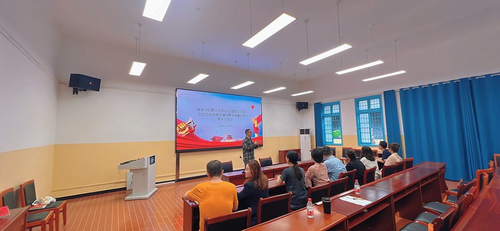9月21日中午,伟德国际1946教工支部在丽泽苑104开展9月份主题党日活动。活动内容为支部书记陈颖卓领学校党委书记罗成翼的专题党课、全体党员集中观看专题教育片和学习讨论伟德国际1946党委理论学习中心组学习内容。全体党员参加,会议由陈颖卓主持。