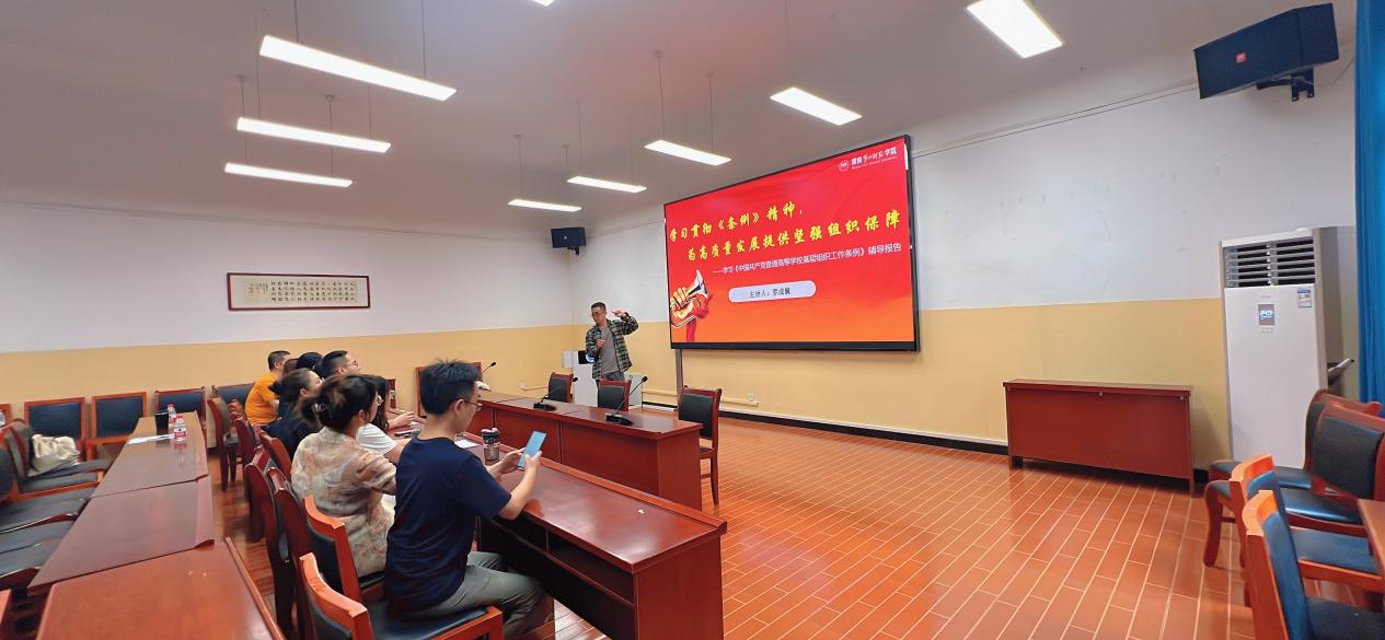 学习活动的第一部分是由陈颖卓领学校党委书记罗成翼的专题党课《学习<中国共产党普通高等学校基层组织工作条例>辅导报告》。党课内容包括说明《条例》修订的背景和意义、修订《条例》遵循的主要原则、《条例》主要修订内容、《条例》对党委领导下的校长负责制作出具体规定、《条例》对加强高校基层党组织建设做了进一步完善、《条例》对党员队伍建设提出明确要求、《条例》对高校党的纪律检查工作的具体要求、《条例》对高校干部和人才工作提出明确要求、《条例》对加强高校思想政治工作的要求、《条例》对落实高校党建工作责任的相关规定10个方面,深入浅出的讲解了如何根据《条例》开展基层工作。