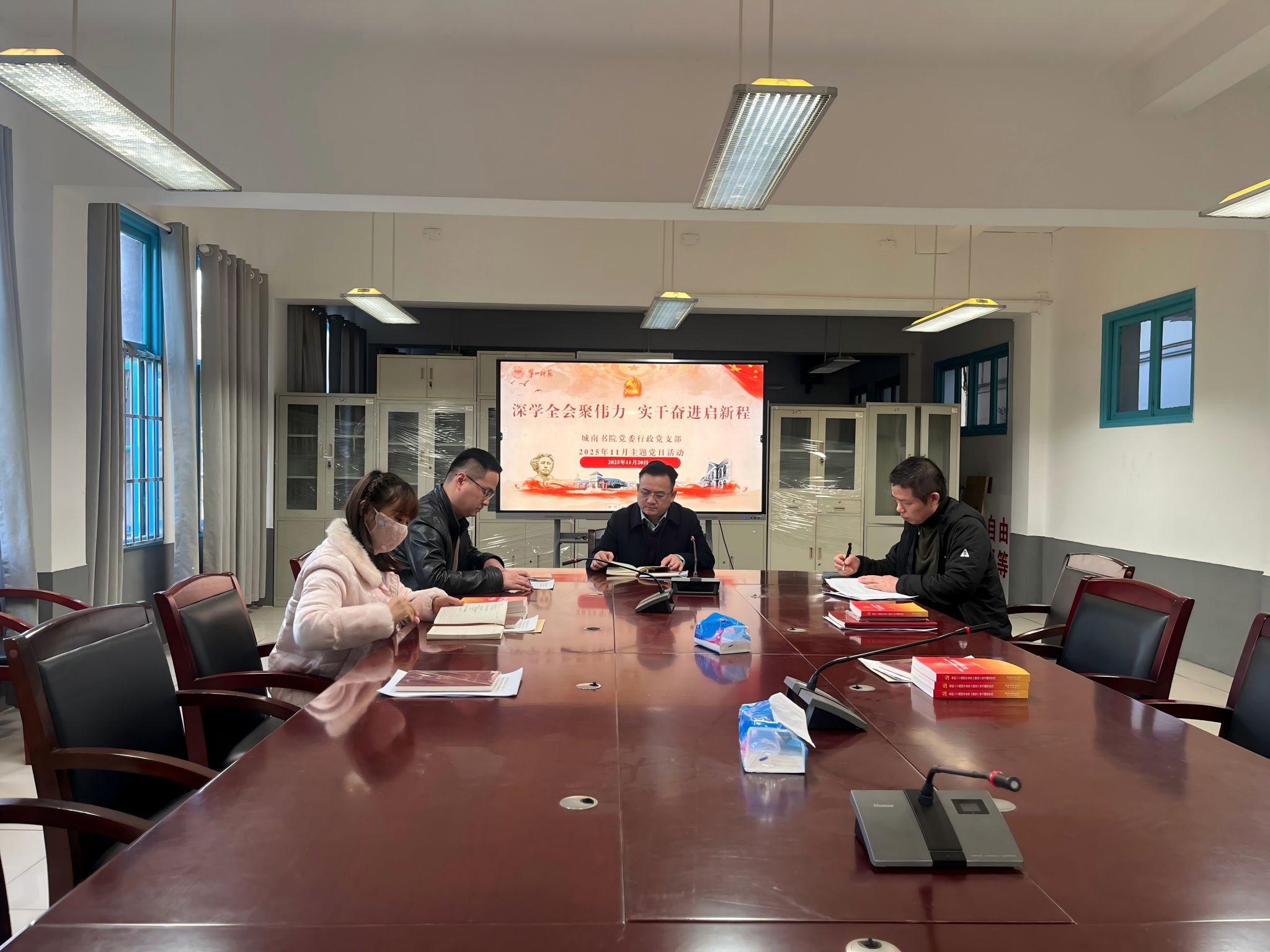 11月20日,伟德国际1946党委行政党支部在艺术楼会议室开展“深学全会聚伟力 实干奋进启新程”主题党日活动。支部全体党员参加,会议由支部书记聂凯主持。