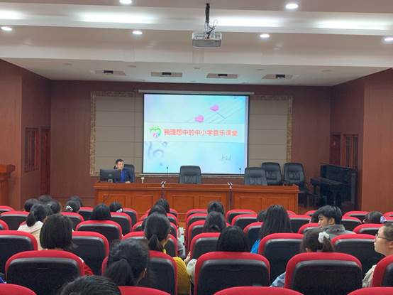 讲座中,郭声健教授用轻松幽默的话语营造了一个愉悦的氛围。他从政策的角度和同学们谈了对中小学音乐课堂的认识,着重强调了音乐学科的重要性,紧接着根据自己几十年来的教学经验,把理想中的中小学音乐课堂从十个方面向在场的师生作了生动、详尽的介绍。郭教授说理想中的音乐课堂应是:一个音乐面前人人平等的地方;一个所有学生都能受益的地方;一个身心愉悦美感盈溢的地方;一个学以致用立竿见影的地方;一个兼收并蓄兼容并包的地方;一个想唱就唱天性释放的地方;一个教学相长共同成长的地方;一个音画交融歌舞升平的地方;一个不为考试担惊受怕的地方;一个润物无声以美育人的地方。