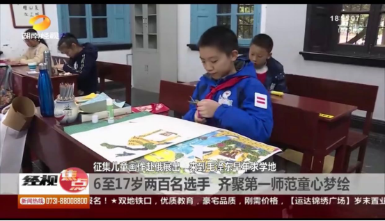 接下来,毛泽东与第一师范纪念馆学生讲解员为大家深情讲述了毛主席与第一师范的故事。随后,龙剑宇宣布活动正式开始。现场两百多名参与长沙站作品选拔的儿童和青少年在志愿者的带领下,分批进入教室创作。他们各施才艺,童心绘梦。孩子们以毛主席学习的地方为作品的主要构思内容,形式上除绘画外,还有雕刻、剪纸等其它艺术形式。在规定的时间内,孩子们一个个有条不紊地沉着作画,气氛热烈而雅静。