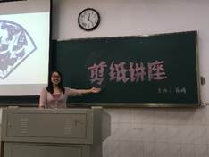 蒋晴参加“雷锋杯”全国校园剪纸邀请赛会议合影 蒋晴老师给参赛选手做剪纸创作讲座