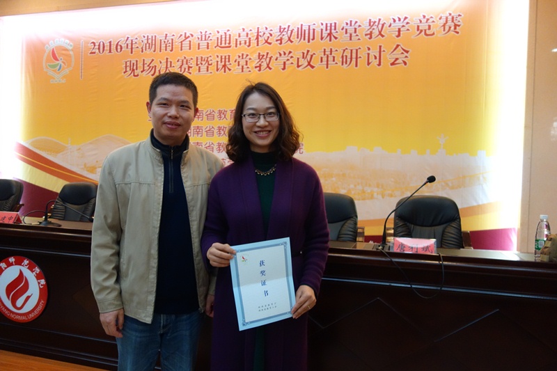 10月29日,由湖南省教育厅、湖南省教育工会主办,湖南省教育科学研究院承办的“2016年湖南省普通高校教师课堂教学竞赛决赛暨课堂教学改革研讨会”在衡阳师范学院举行。我院副院长蔡海军带领参赛选手杨昭昭老师与会。杨昭昭凭借高超的教学艺术摘得大赛文科组一等奖,并被授予“湖南省普通高校教学能手”荣誉称号。