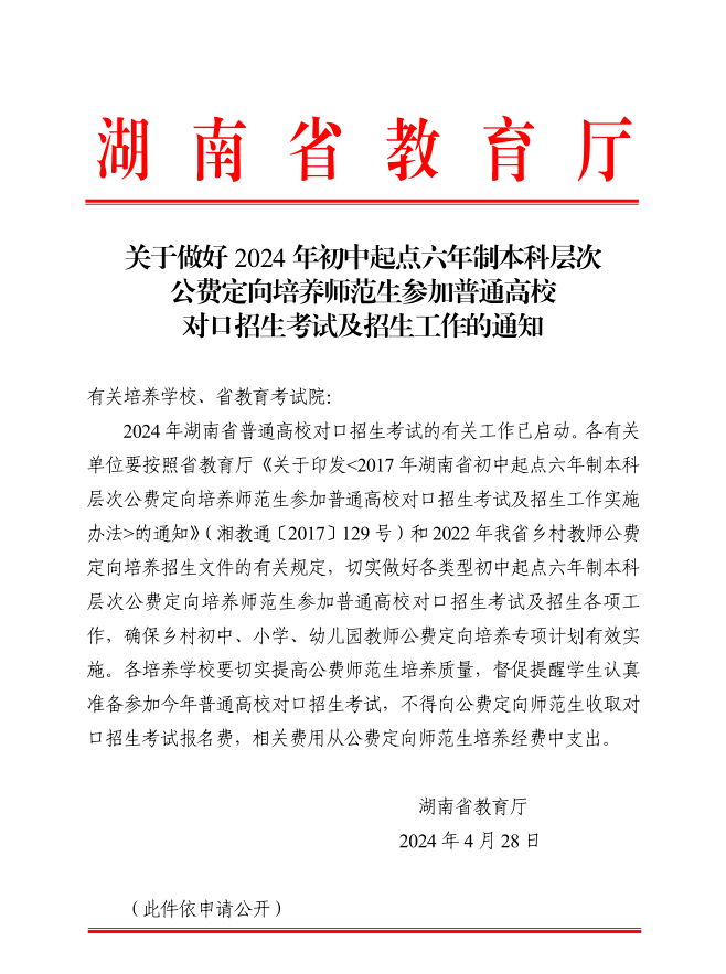 关于做好2024年初中起点六年制本科层次公费定向培养师范生参加普通高校对口招生考试及招生工作的通知